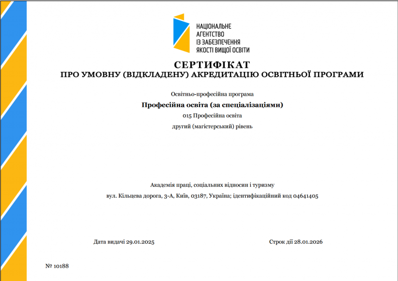 - 231 Соціальна робота - №195, виданий 28 січня 2020 р., термін дії до 28 січня 2025 р.