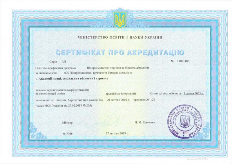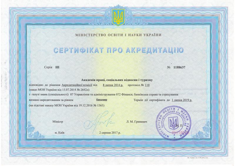 - 075 Маркетинг - Серія НІ №1188642, виданий 02 серпня 2017 р., термін дії до 01 липня 2026 р.