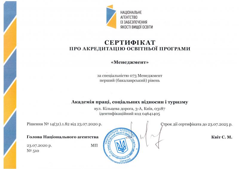 - 073 Менеджмент - №510, виданий 23 липня 2020 р., термін дії до 23 липня 2025 р.