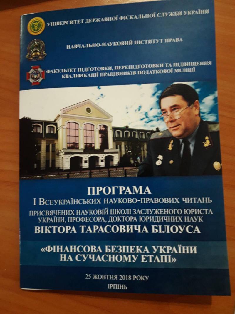 25 жовтня 2018 року у м. Ірпінь в Університеті державної фіскальної служби України відбулися І Всеукраїнські науково-правові читання, присвячені науковій школі заслуженого юриста України, професора, доктора юридичних наук Віктора Тарасовича Білоуса “Фінансова безпека України на сучасному етапі”.