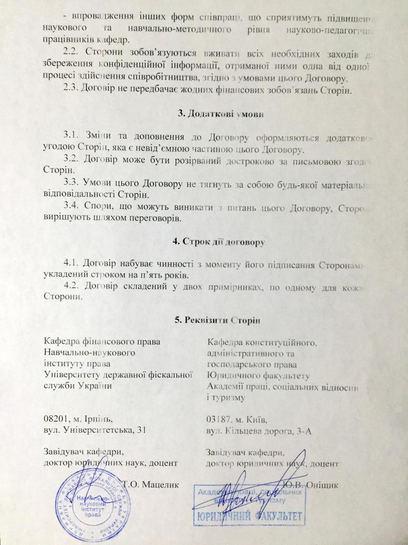 27 грудня 2018 року в м. Ірпінь укладено договір про міжкафедральну співпрацю між кафедрою конституційного, адміністративного та господарського права Юридичного факультету Академії праці, соціальних відносин і туризму в особі завідувача кафедри доктора юридичних наук Оніщика Юрія Віталійовича та кафедрою фінансового права Навчально-наукового інституту права Університету державної фіскальної служби України в особі завідувача кафедри доктора юридичних наук Мацелик Тетяни Олександрівни.