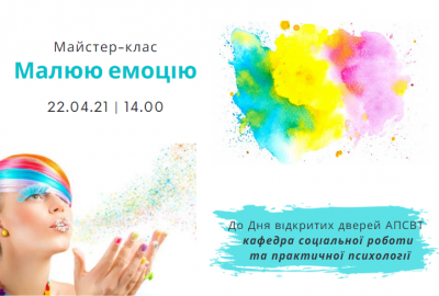 Запрошуємо познайомитися з нашими методами навчання на відкритому занятті з дисципліни «Техніки соціально-психологічного тренінгу» (програма підготовки бакалаврів соціальної роботи). Майстер-клас «Малюю емоцію» проведе практичний психолог вищої категорії, сертифікована арт-терапевтка Ірина Кіореску.