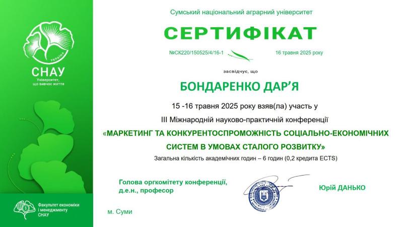 15–16 травня 2025 року здобувачі 4 курсу першого (бакалаврського) рівня вищої освіти Дар’я Бондаренко та Анастасія Міщеряк під науковим керівництвом к.е.н., доцента кафедри маркетингу Надії Писаренко взяли участь у ІІІ Міжнародній науково-практичній конференції «Маркетинг та конкурентоспроможність соціально-економічних систем в умовах сталого розвитку».