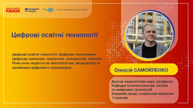 У рамках курсу професор кафедри інтелектуальних систем та цифрових технологій Олексій Самойленко 13 жовтня провів лекцію на тему "Цифрові освітні технології". Він розглянув вплив цифрових технологій на освіту та трансформацію ролі педагога в сучасному навчальному процесі.