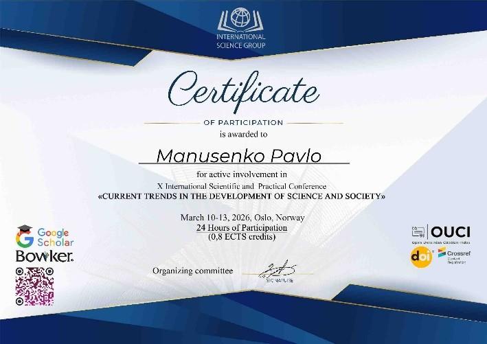 ПАВЛО МАНУСЕНКО, студент 2 курсу напряму підготовки «Соціальна робота» реалізував участь у 10-й Міжнародній науково-практичній конференції «Current trends in the development of science and society», місце проведення – Осло (Норвегія), 10–13 березня 2026 р. Науковий доробок підготовлено англійською мовою (0,85 др. арк.) і присвячено всесвітньо відомій вулиці Рима: «Via Margutta: the street with rich cultural heritage and legendry Roman Holiday (1953, USA)» [«Vіа Маргутта: вулиця з багатою культурною спадщиною і легендарними «Римськими канікулами» (1953, США)»]. Веб посилання на видання: https://isg-konf.com/current-trends-in-the-development-of-science-and-so...